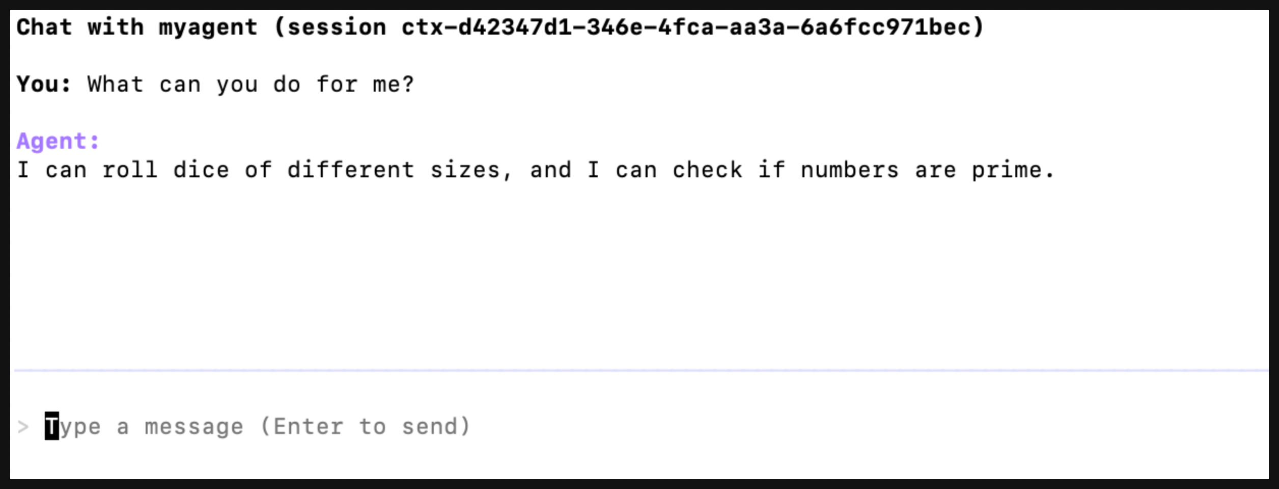 agent.yamlfile. Then, it opens a terminal window where you can start chatting with your agent.arctl agent run myagent