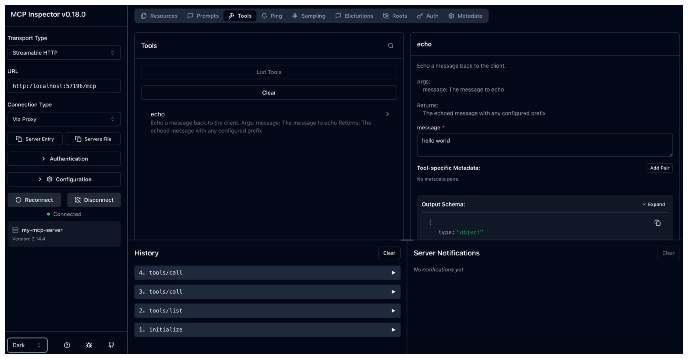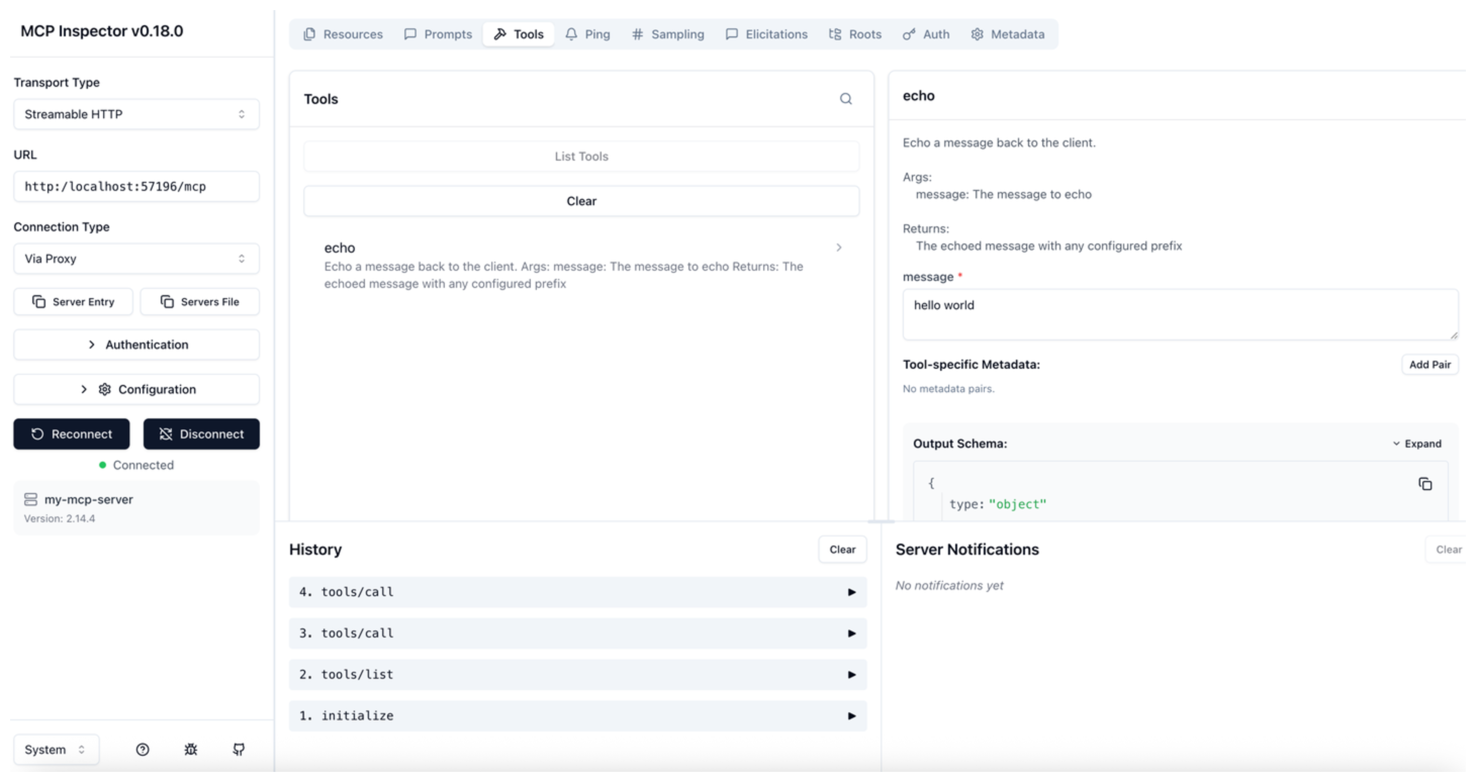 echotool. Enter any string in themessagefield, and click Run Tool. Verify that your string is echoed back to you.
